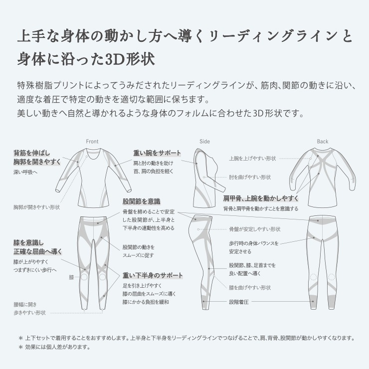 動きやすいよう設計された 3D 形状により、美しく上手な身体の動かし方を意識できます。