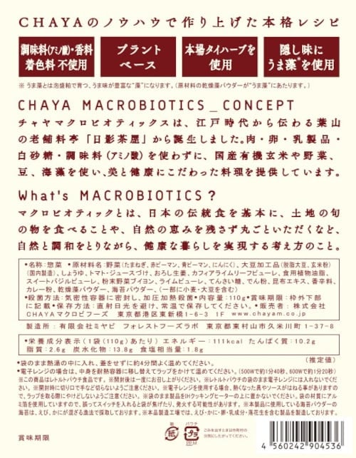 ○原材料:野菜(たまねぎ、赤ピーマン、青ピーマン、にんにく)、大豆加工品(脱脂大豆、玄米粉)(国内製造)、しょうゆ、トマト・ジュースづけ、おろし生姜、カフィアライムリーフピューレ、食用植物油脂、スイートバジルピューレ、粉末野菜ブイヨン、ライムピューレ、てんさい糖、でん粉、昆布エキス、香辛料、カレー粉、乾燥藻パウダー、海苔パウダー、(一部に小麦・大豆を含む)