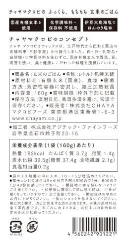 ○栄養成分表示: (1袋(160g)当たり)エネルギー:182kcal、たんぱく質:3.7g 、脂質:1.4g 、 炭水化物:39.5g 、食塩相当量: 0.2g