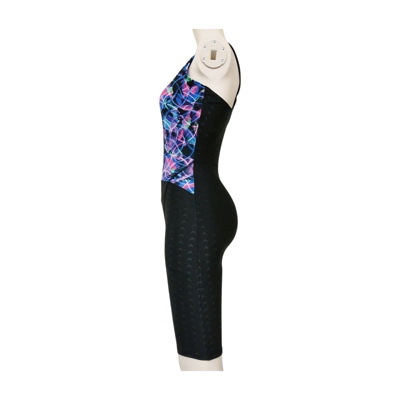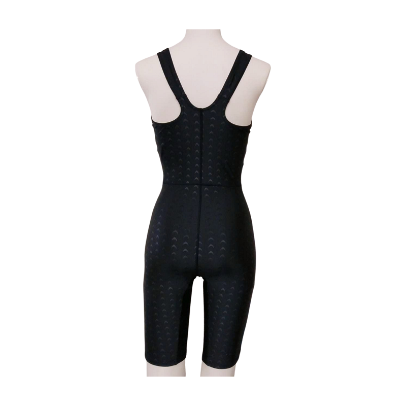 本格仕様の競泳水着オールインワンタイプ スタイルアップを目指した安心感のある膝上丈と、どの角度から見てもラインがきれいに見えるような柄にこだわりました。
