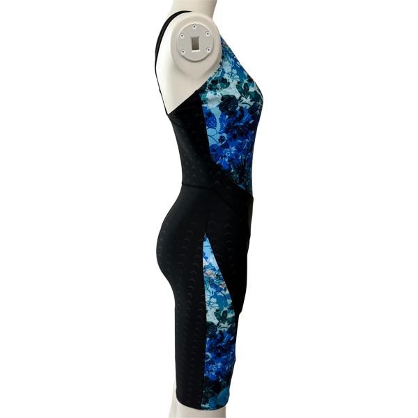 本格仕様の競泳水着オールインワンタイプ スタイルアップを目指した安心感のある膝上丈と、どの角度から見てもラインがきれいに見えるような柄にこだわりました。